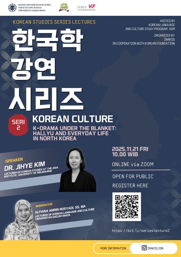 Yogyakarta, 21 November 2025 — INAKOS bekerja sama dengan Program Studi Bahasa dan Kebudayaan Korea UGM dan melalui pendanaan hibah dari Korea Foundation kembali menyelenggarakan seri kuliah umum daring dalam rangkaian Korean Studies Series Lectures. Kuliah umum seri kedua ini dilaksanakan pada 21 November 2025 secara daring dengan menghadirkan Dr. Kim Jihye dari University of Melbourne sebagai narasumber yang membawakan topik “K-drama Under the Blanket: Hallyu and Everyday Life in South Korea.”