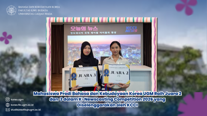 Jakarta, 27 Februari 2026 — Empat mahasiswa Program Studi Bahasa dan Kebudayaan Korea, Universitas Gadjah Mada (UGM), berpartisipasi dalam ajang K-Newscasting Competition 2026. Kompetisi membaca berita dalam bahasa Korea ini diselenggarakan oleh Korean Cultural Center Indonesia (KCCI) sebagai wadah untuk meningkatkan keterampilan berbahasa dan melatih kemampuan public speaking para peserta. Dalam kompetisi tersebut, dua mahasiswa berhasil menorehkan prestasi membanggakan dengan meraih Juara 2 oleh Matilda Kinasih Dewi dan Juara 3 oleh Mulya Ghefira Azzahra.