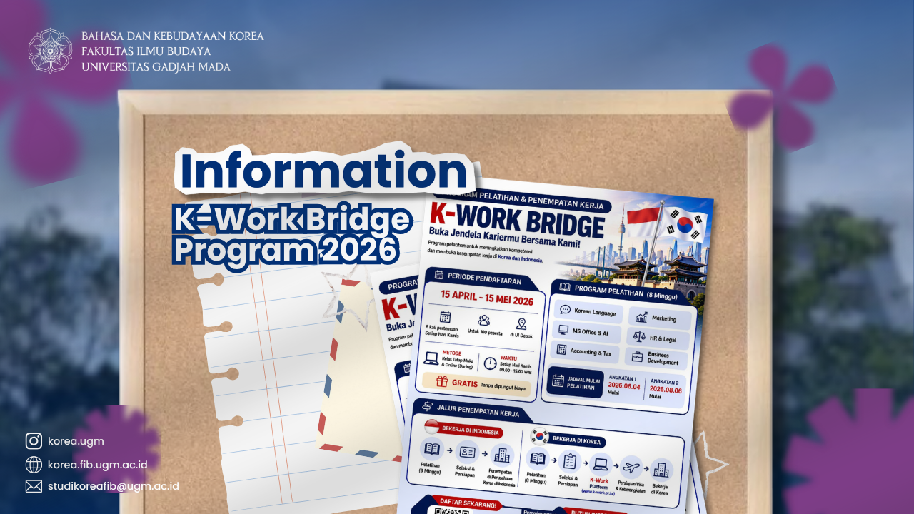 Jakarta, 27 Februari 2026 — Empat mahasiswa Program Studi Bahasa dan Kebudayaan Korea, Universitas Gadjah Mada (UGM), berpartisipasi dalam ajang K-Newscasting Competition 2026. Kompetisi membaca berita dalam bahasa Korea ini diselenggarakan oleh Korean Cultural Center