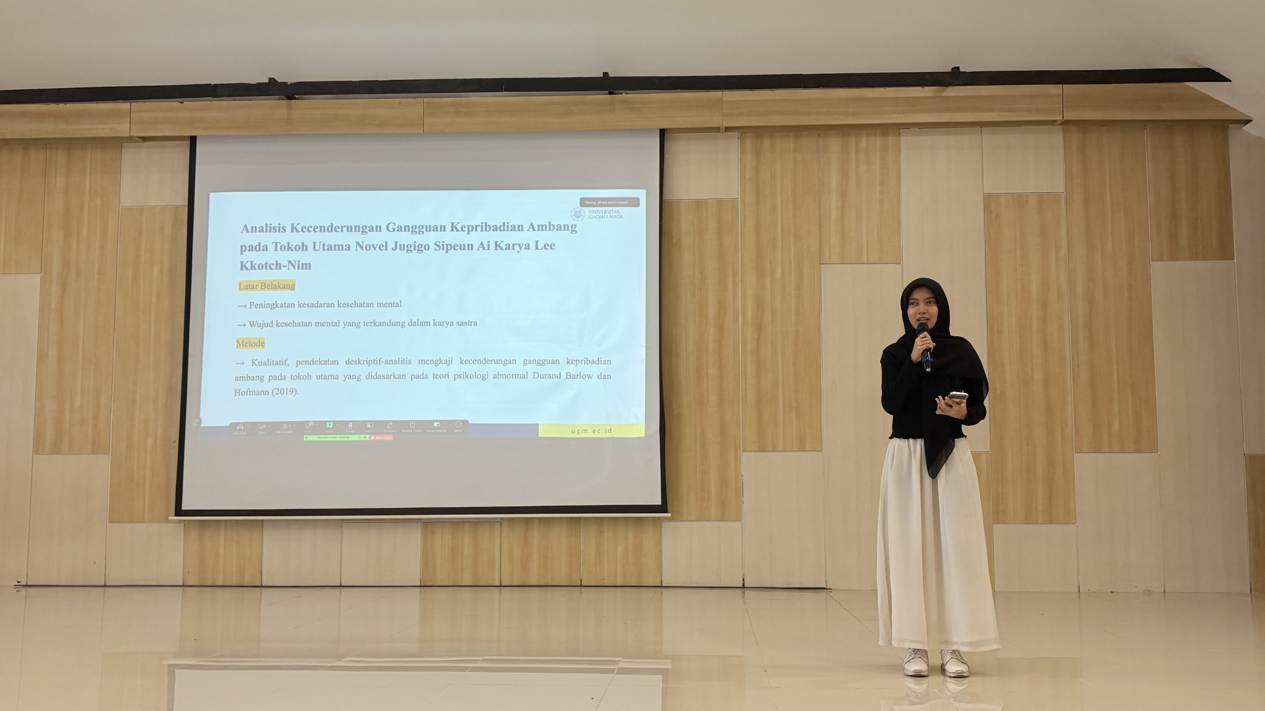 The program began with a presentation by the K-Lit UGM committee on Chung Bora’s works and the influence of Cursed Bunny in contemporary Korean literature. Following this, the winner of the scientific writing competition was announced: Az Zahra Ahsana Amala, a student of the Korean Language and Culture Study Program at UGM, who presented her paper titled An Analysis of Borderline Personality Disorder Tendencies in the Main Character of Lee Kkonnnim’s Novel Jugigo Sipeun Ai.