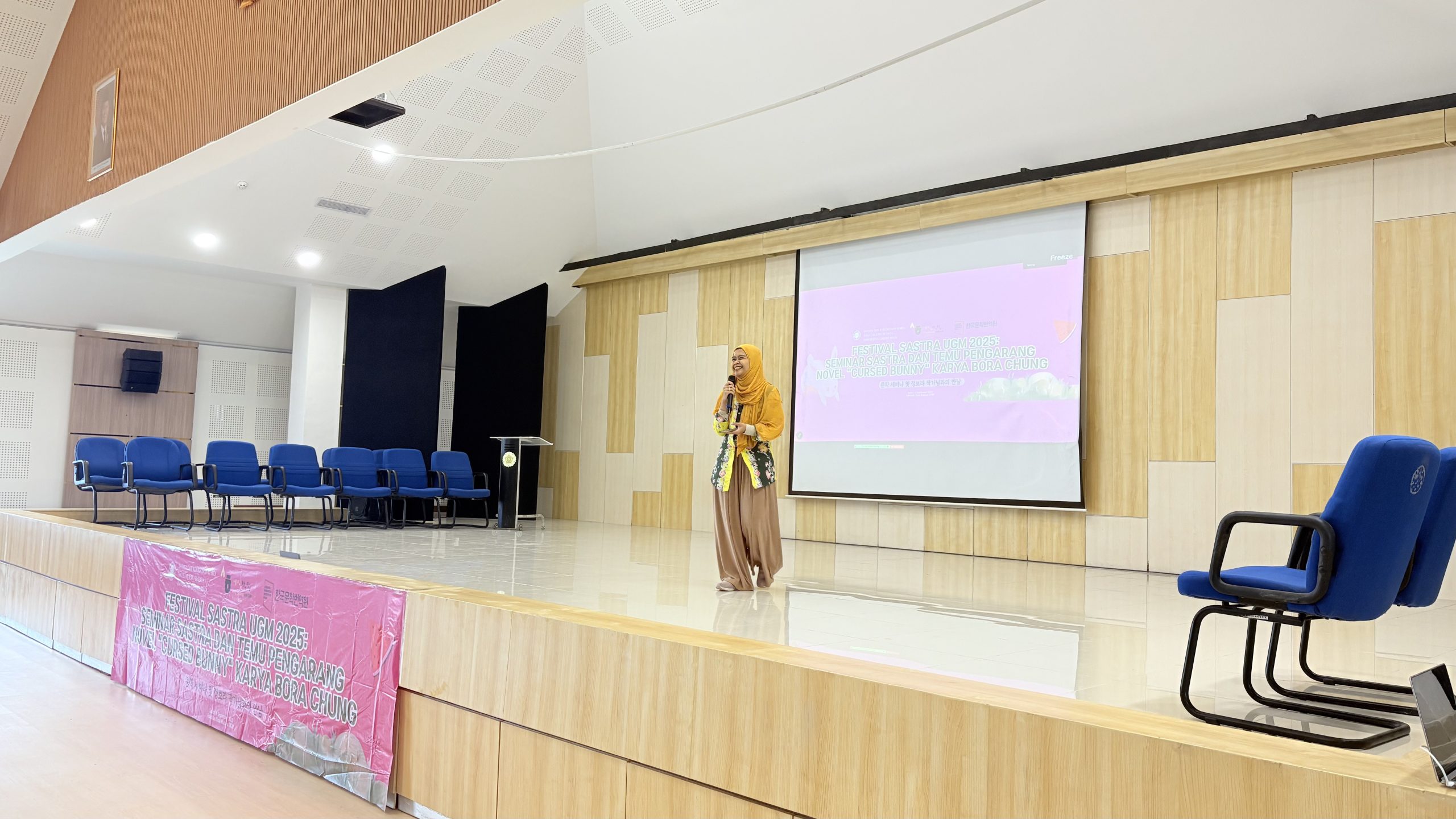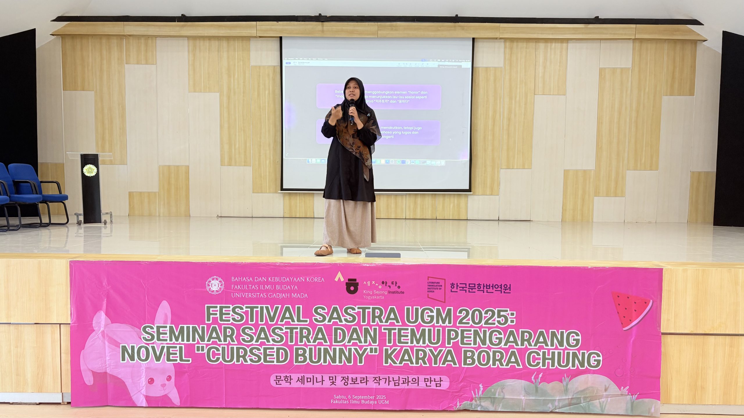 Yogyakarta, September 6, 2025 — The Korean Language and Culture Study Program, Faculty of Cultural Sciences, Universitas Gadjah Mada, successfully held the UGM Korean Literature Festival 2025 at the Purbacaraka Auditorium. The event took place from 09.00 to 11.30 WIB and featured a series of activities including a literature seminar, award announcement, and a talk show with Cursed Bunny author, Chung Bora.