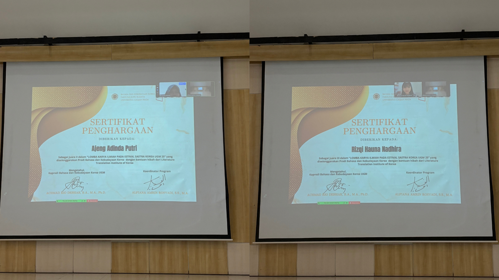 The event continued with the announcement of competition winners. In the Korean Literature Scientific Paper Competition, Az-Zahra Ahsana Amala won first place and received a prize of Rp3,000,000. Zahra also had the opportunity to present her paper titled “Analysis of Borderline Personality Disorder Tendencies in the Main Character of Lee Kkonnnim’s Novel Jugigo Sipeun Ai.” Second place went to Ajeng Adinda Putri (Rp1,500,000), and third place to Rizqi Hauna Nadhira (Rp1,000,000).