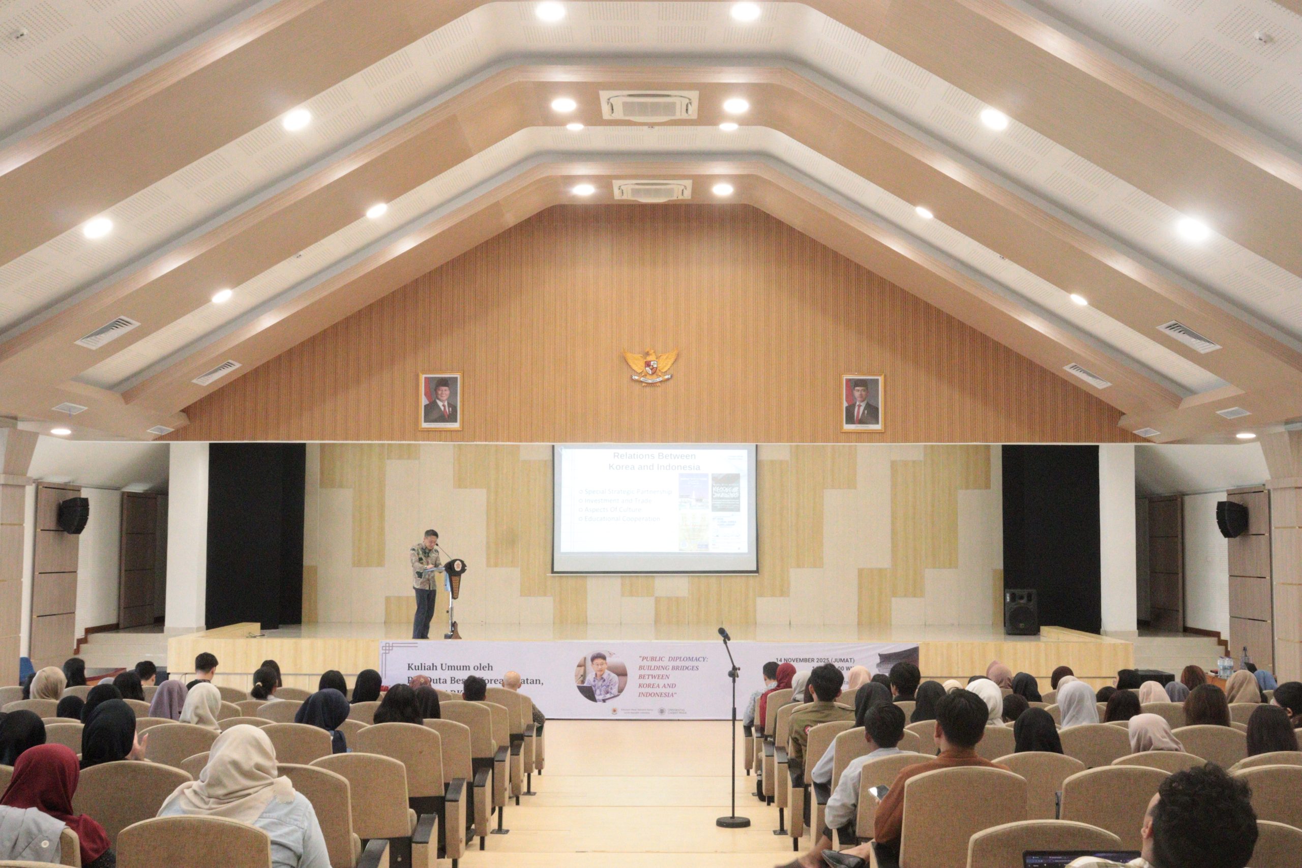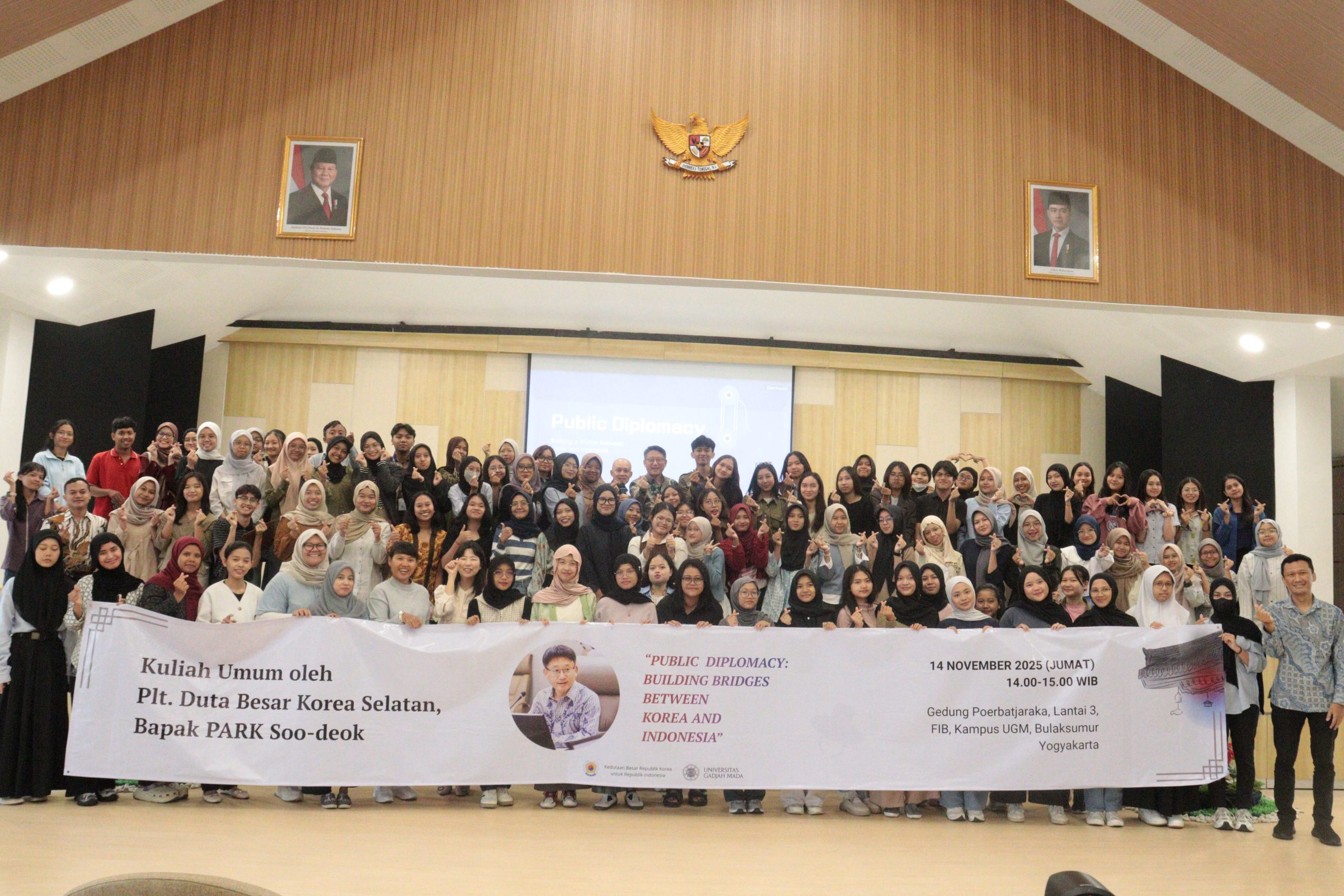 Yogyakarta, 14 November 2025 — The Korean Language and Culture Study Program, Faculty of Cultural Sciences, Universitas Gadjah Mada, held a public lecture titled “Public Diplomacy: Building Bridges Between Korea and Indonesia” featuring Mr. Park Soo-deok, Acting Ambassador of the Republic of Korea, as the keynote speaker. The event took place at the 3rd-floor Auditorium of the Poerbatjaraka Building and served as one of the activities in the 20th Korean Day series.