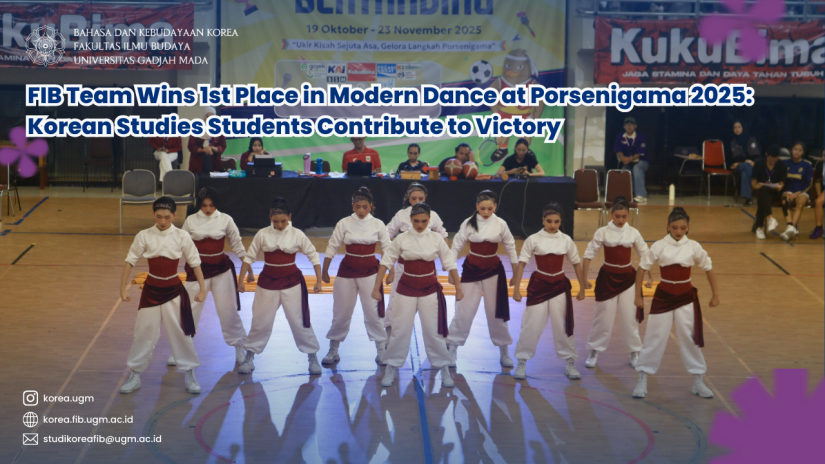 In 2025, three students from the Korean Language and Culture Program took part in the Modern Dance category of Porsenigama (Universitas Gadjah Mada Sports and Arts Week), held at GOR Pancasila UGM. The preparation process took place intensively from 23 September to 2 November 2025. The Preliminary round on 3 November served as a crucial stage in assessing team readiness, followed by the announcement of the Faculty of Cultural Sciences team as one of the Top 5 finalists on 8 November 2025. The entire series of activities reached its peak during the Final competition on 9 November 2025.