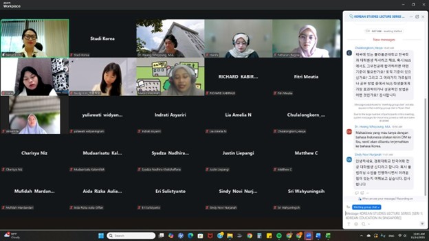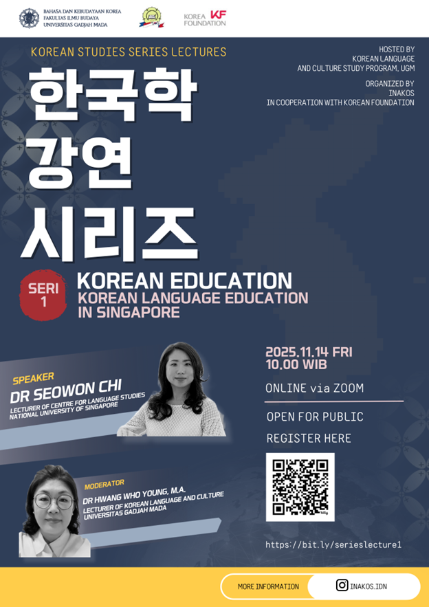 Yogyakarta, 14 November 2025 — INAKOS, in collaboration with the Korean Language and Culture Undergraduate Program at Universitas Gadjah Mada and supported by funding from the Korea Foundation, held the first lecture in the Korean Studies Series Lectures. The session took place online on 14 November 2025 under the title “Korean Language Education in Singapore.” The invited speaker was Dr. Ji Seowon from the Centre for Language Studies, National University of Singapore.