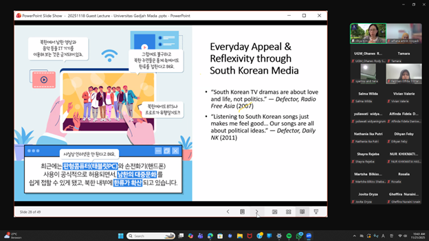 Yogyakarta, 21 November 2025 — INAKOS, in collaboration with the Korean Language and Culture Program at Universitas Gadjah Mada and supported by grant funding from the Korea Foundation, continued its online Korean Studies Series Lectures with the second installment of the program. The lecture, held on 21 November 2025 via Zoom, featured Dr. Kim Jihye from the University of Melbourne, who presented a talk titled “K-drama Under the Blanket: Hallyu and Everyday Life in South Korea.”